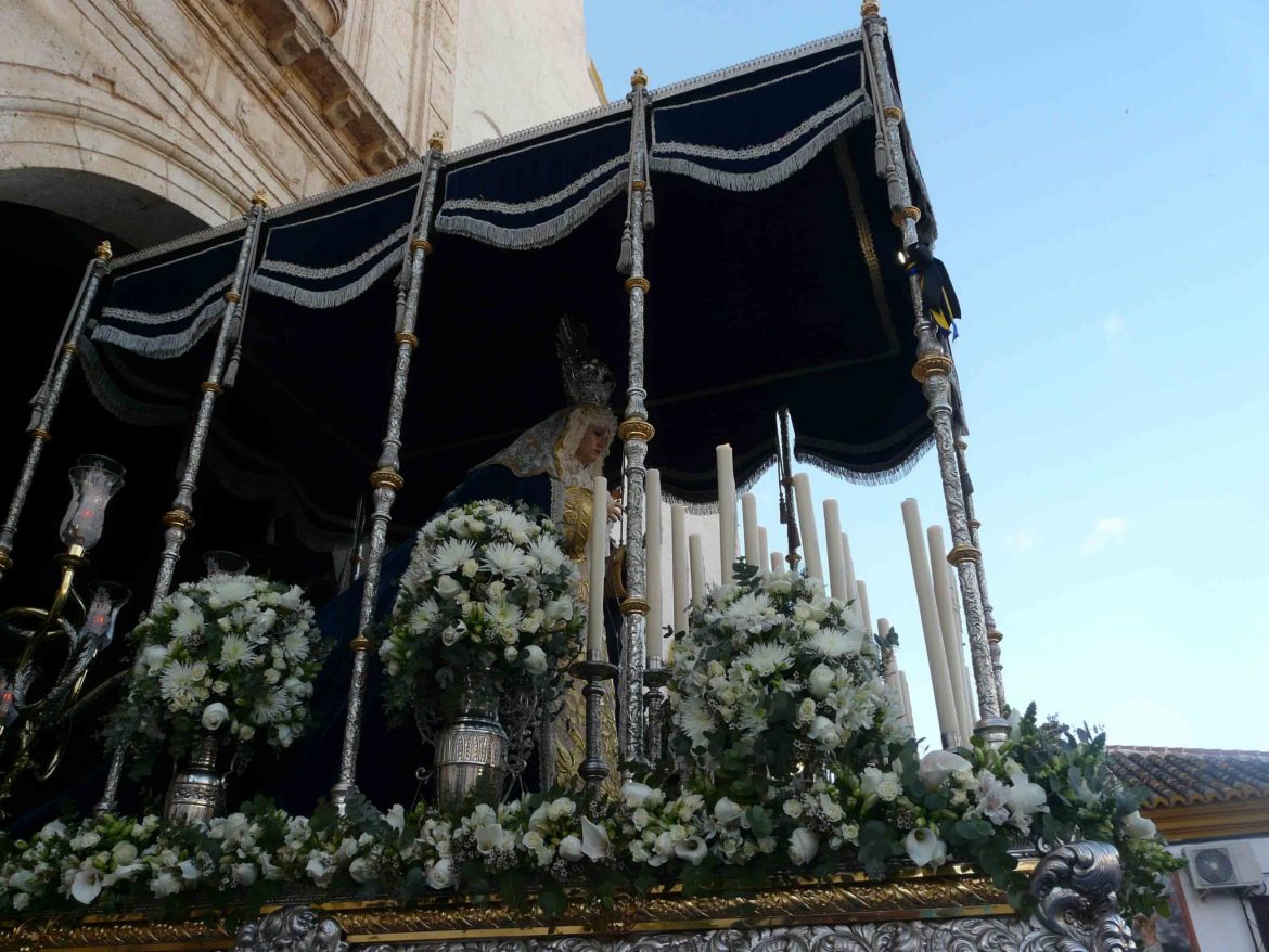 Con nuestro Padre Jesús ya en la calle, nuestra procesión va tomando forma. Guión, Nazarenos, Mantillas, Representantes de la hermandad y finalmente Nuestra Sagrada Titular María Santísima de Paz, que apareció en el cancel de la Iglesia magníficamente entronada con sus mejores galas y perfectamente adornada con las flores que solo el hermano Eduardo sabe colocar. Se estrenó por fin en su cargo nuestro flamante nuevo mayordomo, que imitó de forma magistral a nuestro querido Frascorrillo, su padre, Paco parecía que había estado toda su vida siendo el guiador de los costaleros y del trono.