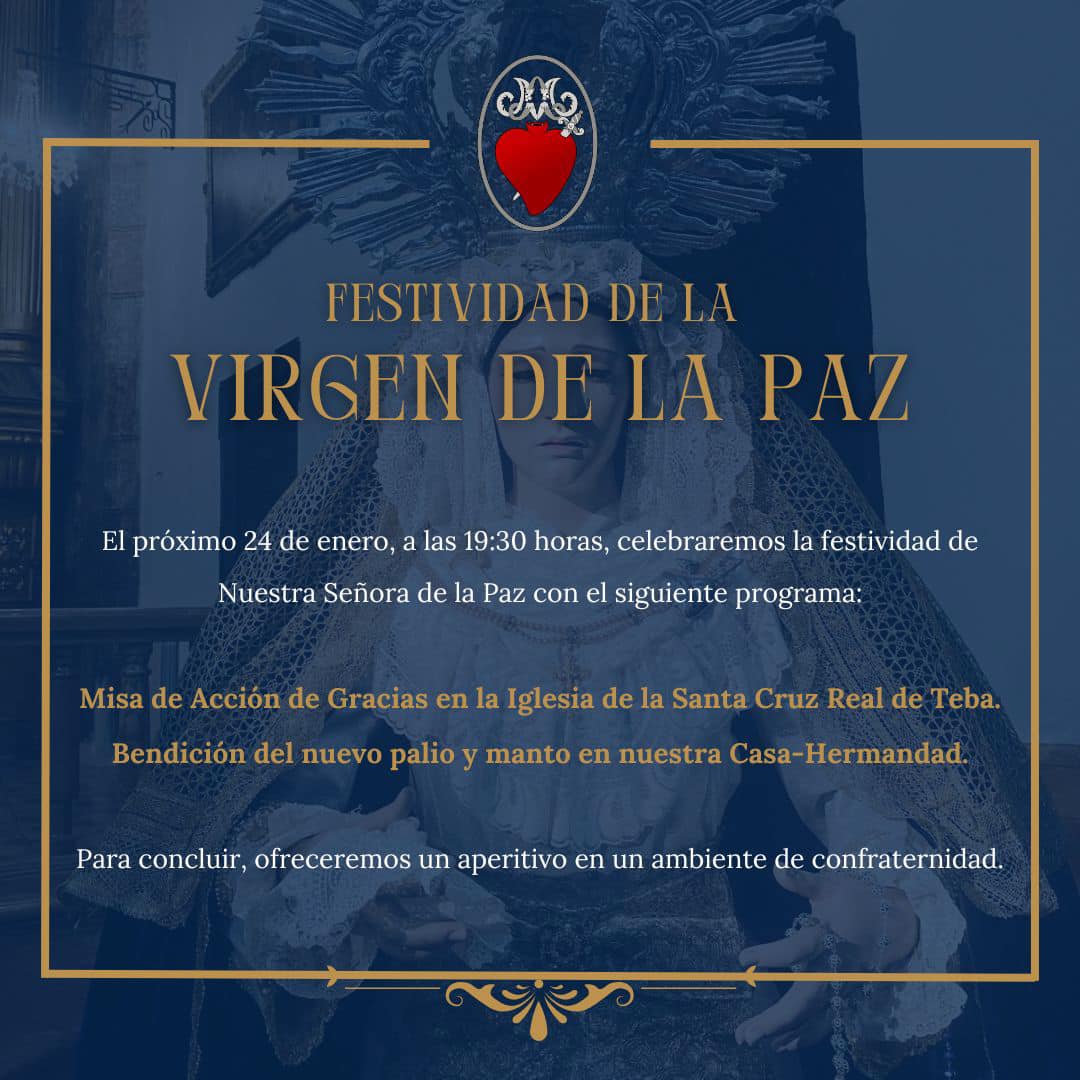 Este año, de manera excepcional, celebraremos la Festividad de Nuestra Señora de la Paz. Te invitamos a acompañarnos el próximo 24 de enero, a las 19:30 horas, en la Iglesia de la Santa Cruz Real de Teba para una Misa de Acción de Gracias.