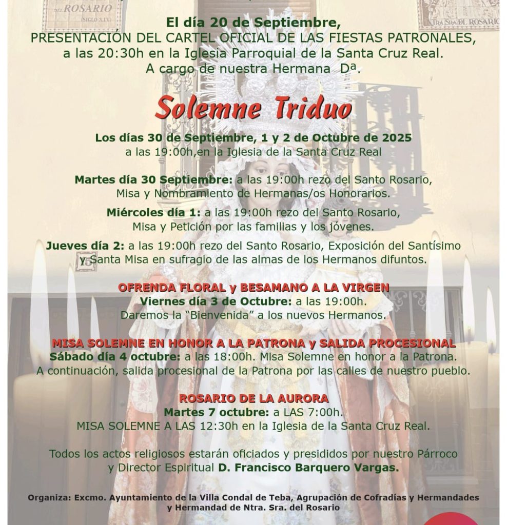 Noticias Fiestas en Honor a Nuestra Señora del Rosario. Patrona y Alcaldesa Perpetua de la Villa Condal de Teba. por admin septiembre 23, 2025 septiembre 23, 2025 15 0 comentario Publicación anterior Día de la Hermandad 2025 Siguente publicación Curso de Iniciación al Corte del Jamón También te puede interesar Curso de Iniciación al Corte del Jamón octubre 16, 2025 Día de la Hermandad 2025 agosto 26, 2025 PREGON FERIA 2025 julio 31, 2025 YA HUELE A FERIA julio 30, 2025 Lotería de Navidad julio 30, 2025 Presentación Cartel Romería 2025 mayo 12, 2025 Semana Santa 2025 abril 27, 2025 XXXVIII PREGÓN DE LA SEMANA SANTA 2025 marzo 31, 2025 Semana Santa 2025 marzo 6, 2025 Encarnación Lora Jiménez, una vida dedicada a la... marzo 4, 2025 Deja un comentario Cancelar respuestaLo siento, debes estar conectado para publicar un comentario.