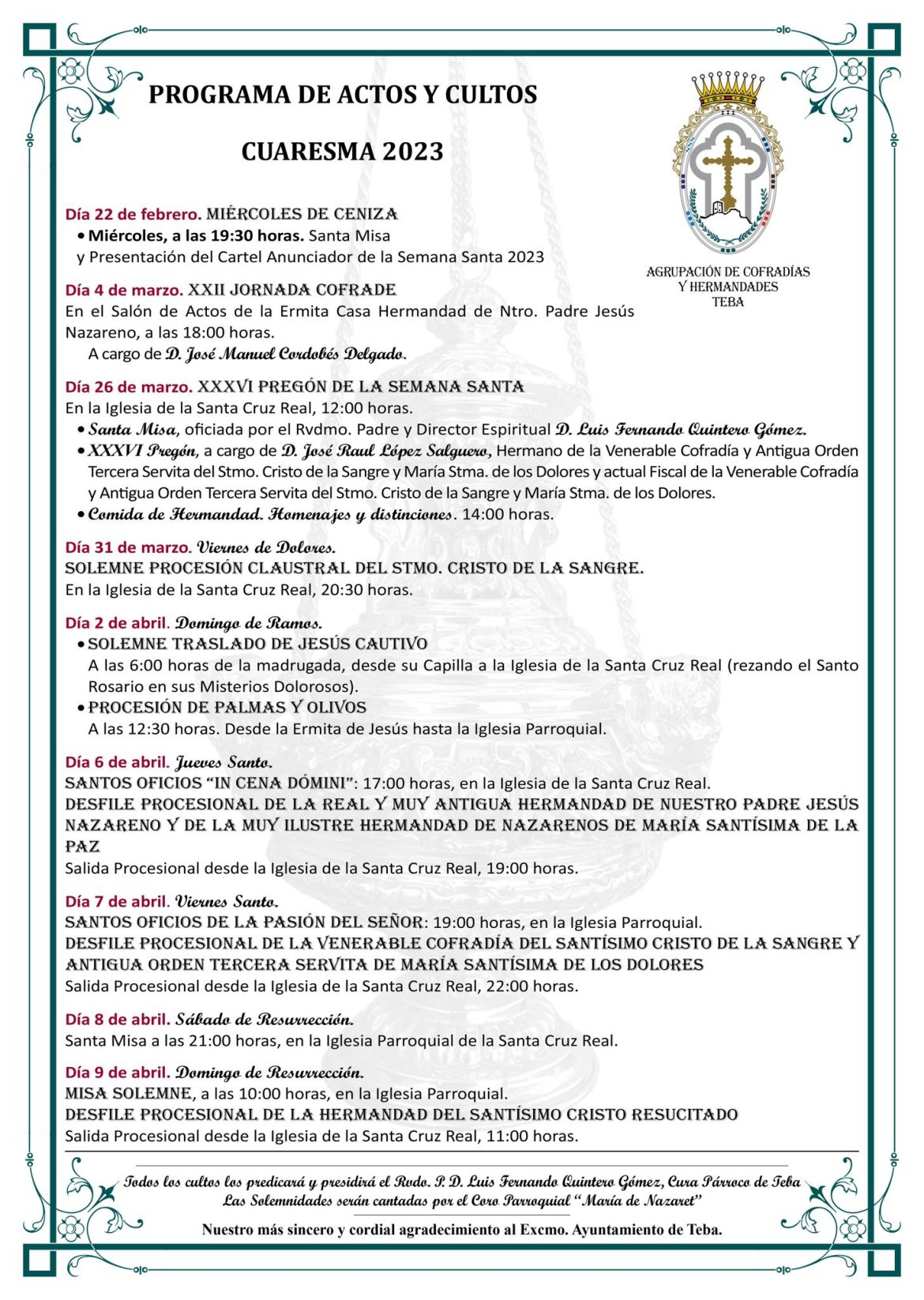 Noticias Programa Cuaresma 2023 por admin febrero 23, 2023 febrero 23, 2023 191 0 comentario Publicación anterior Programa de Actos y Cultos Semana Santa 2023 Siguente publicación Actos y Cultos en honor a Nuestra Sagrada Titular También te puede interesar III CONCURSO DE POSTALES NAVIDEÑAS noviembre 3, 2025 Sorteo de la Feria del Queso 2025 octubre 24, 2025 Curso de Iniciación al Corte del Jamón octubre 16, 2025 Fiestas en Honor a Nuestra Señora del Rosario.... septiembre 23, 2025 Día de la Hermandad 2025 agosto 26, 2025 PREGON FERIA 2025 julio 31, 2025 YA HUELE A FERIA julio 30, 2025 Lotería de Navidad julio 30, 2025 Presentación Cartel Romería 2025 mayo 12, 2025 Semana Santa 2025 abril 27, 2025 Deja un comentario Cancelar respuestaLo siento, debes estar conectado para publicar un comentario.